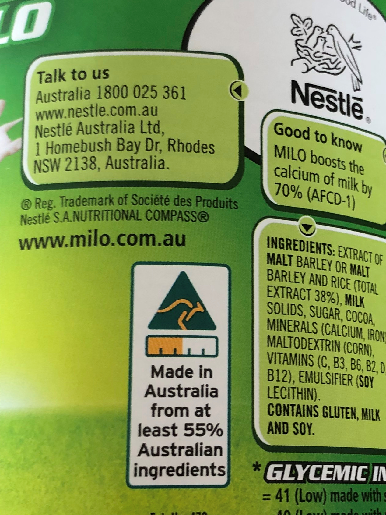 Australian MILO is a nutritious malt / chocolate energy food drink. Kids love the granules sprinkled on ice-cream.
